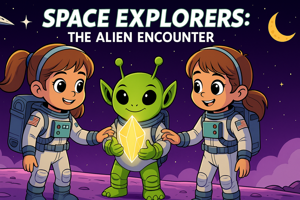 Join two brave young astronauts as they travel across the stars and land on a mysterious purple planet. What starts as a routine mission turns into a heartwarming adventure when they meet a friendly alien holding a glowing crystal.